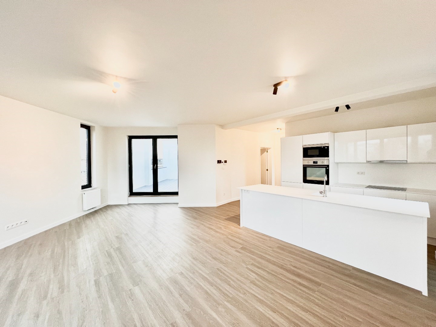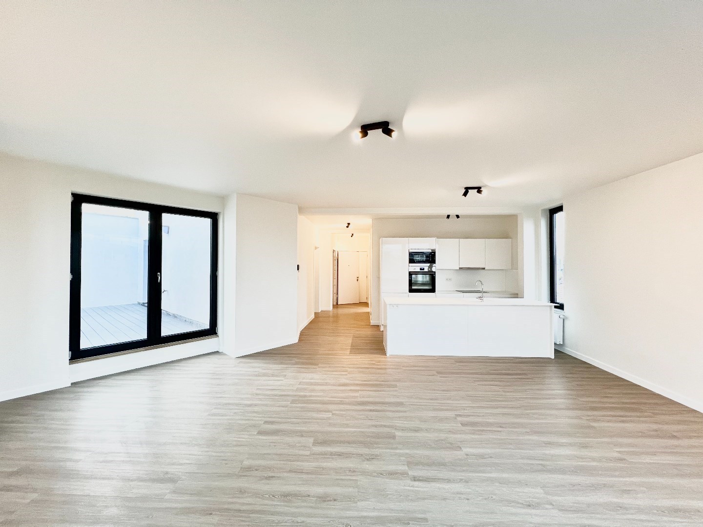 Inkomhal met vestiaire kasten en gastentoilet, lichtrijke leefruimte met open geïnstalleerde keuken. Aansluitend vind je een ruim gezellig terras.