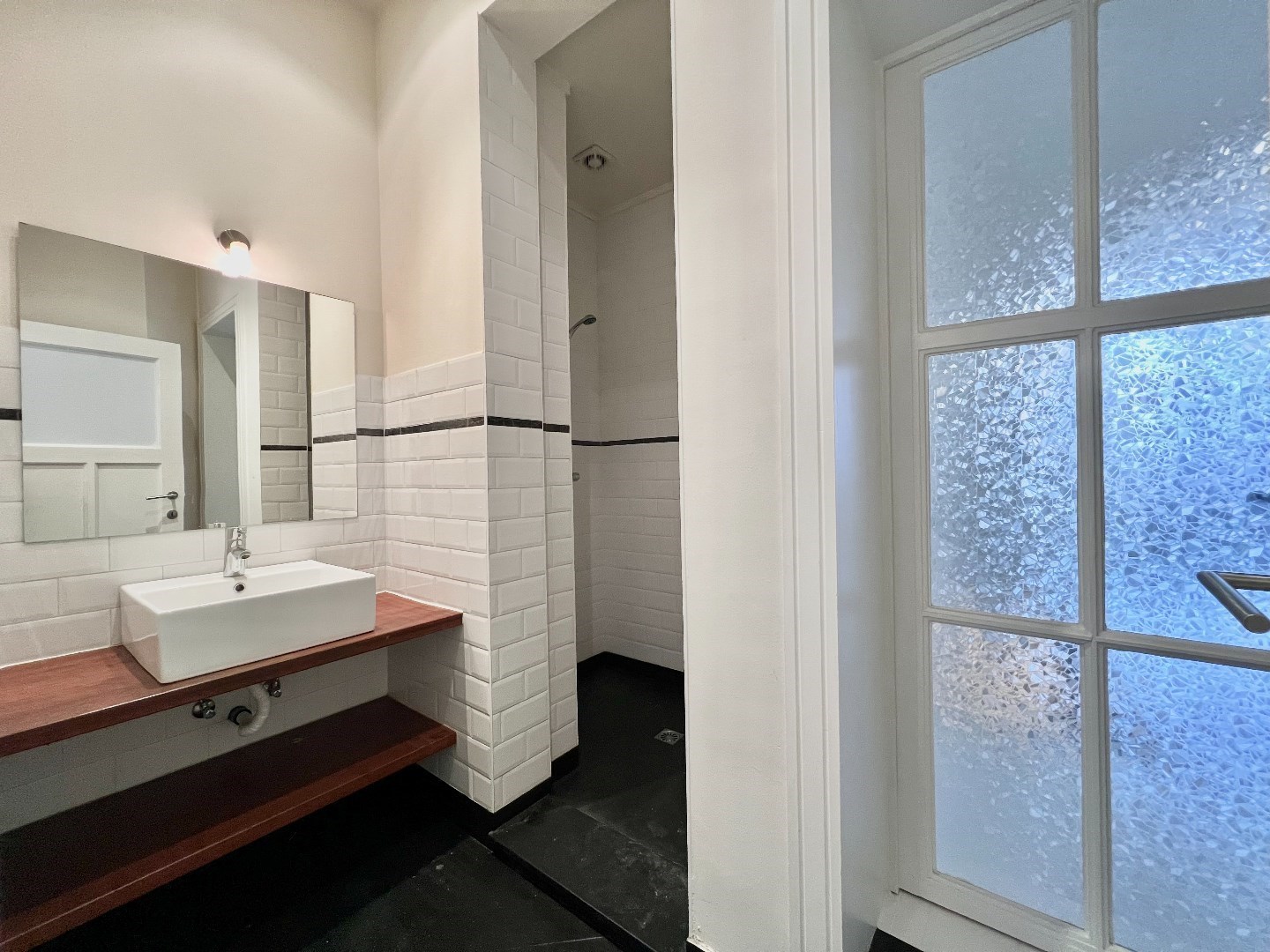 De badkamer is voorzien van douche en lavabo.