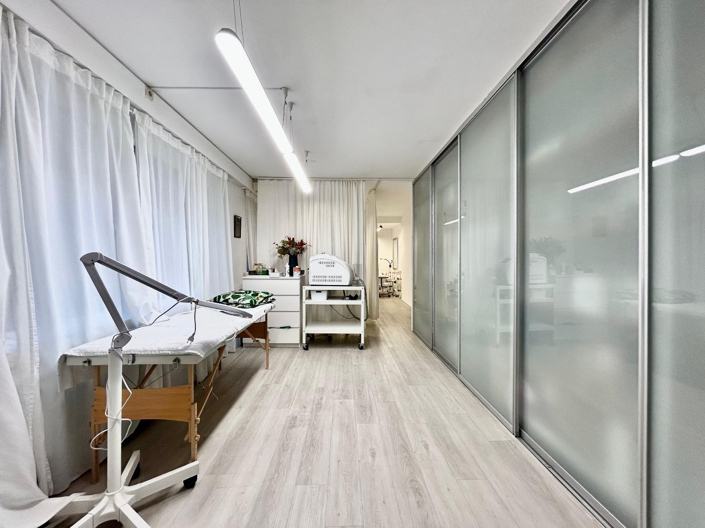 Entree met aparte ruimte vooraan. Centraal gelegen sanitair en keuken.