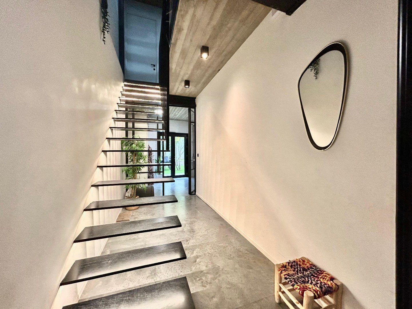 Via de stalen trap betreedt u de eerste verdieping. Deze is voorzien van 3 slaapkamers met ingebouwd meubilair en een grote masterbedroom met ensuite een badkamer. U vindt ook nog een tweede lichtrijke badkamer met bad, aparte douche en een toilet.