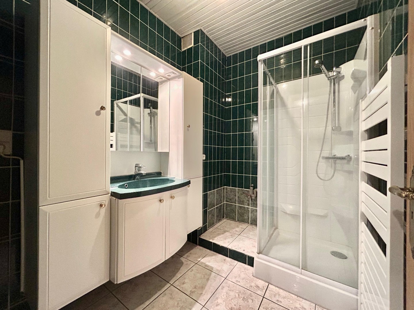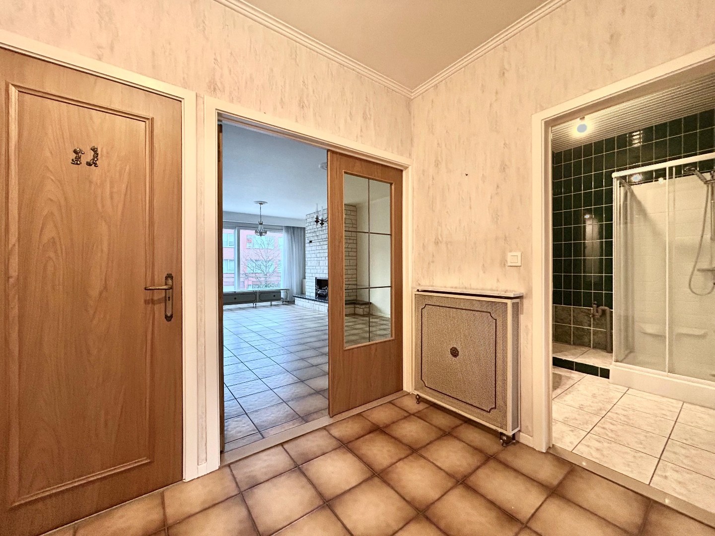Centraal gelegen vindt u een ruime inkomhal met badkamer voorzien van lavabo, douche en plaats voor wasmachine en droogkast. Er is ook een apart gastentoilet voorzien.