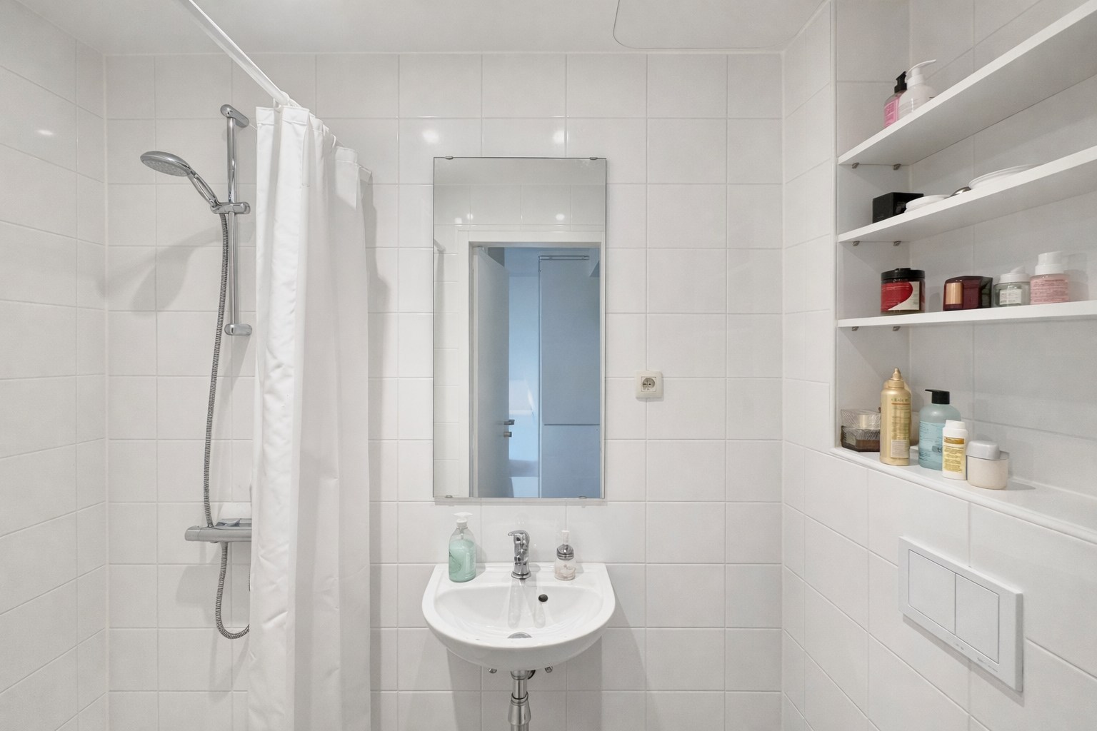 De kamer ligt aan de achterkant van het gebouw, op de derde verdieping, en is slim ingedeeld met een moderne afwerking. De slaapkamer is voorzien van een bedframe, praktische inbouwkasten en een scheidingswand voor extra privacy. Daarnaast beschikt de kamer over een eigen badkamer met douche, lavabo en toilet.